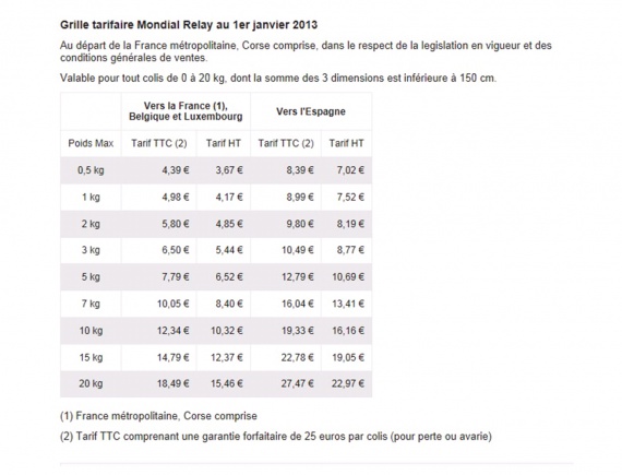 Pour bénéficier de la livraison Mondial Relay le prix de votre article ne doit pas être supérieur à 400. Tarifs applicables au 1er mars 2021. Date de validité à partir du 01012017.